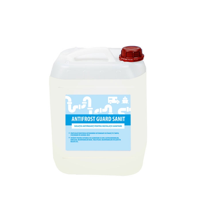 Antifrost Guard Sanit este un antigel concentrat dezvoltat special pentru protejarea sistemelor de alimentare cu apa pentru toalete si rezervoare utilizate in rulote, autocaravane, barci etc impotriva deteriorarii determinate de inghet pe timpul stationarii in sezonul rece.